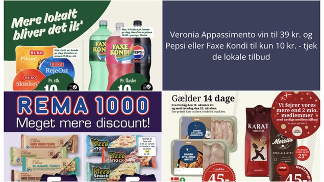 Hos Min Købmand kan du få flere varianter af Pepsi eller Faxe Kondi til kun 10 kr. pr. flaske (1,5 liter). Bemærk, at der er en begrænsning på 4 flasker pr. kunde pr. dag. Tilbuddet gælder fra 17. oktober til 23. oktober.