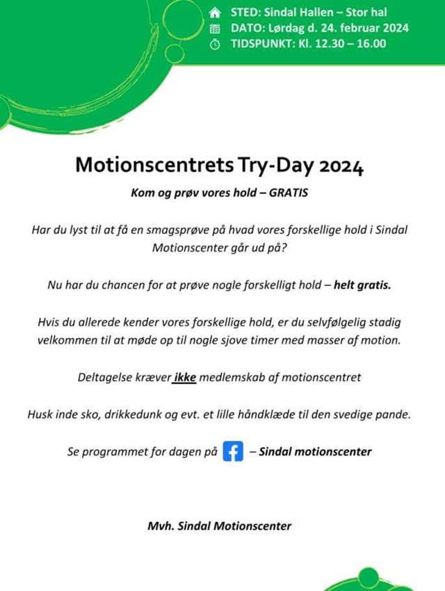 "Try Day 2024" finder sted fra kl. 12.30 til 16.00 i den store sal i Sindal hallen. For at deltage bedes du booke din plads på sindalmotion.dk, hvis du ønsker at låne udstyr.